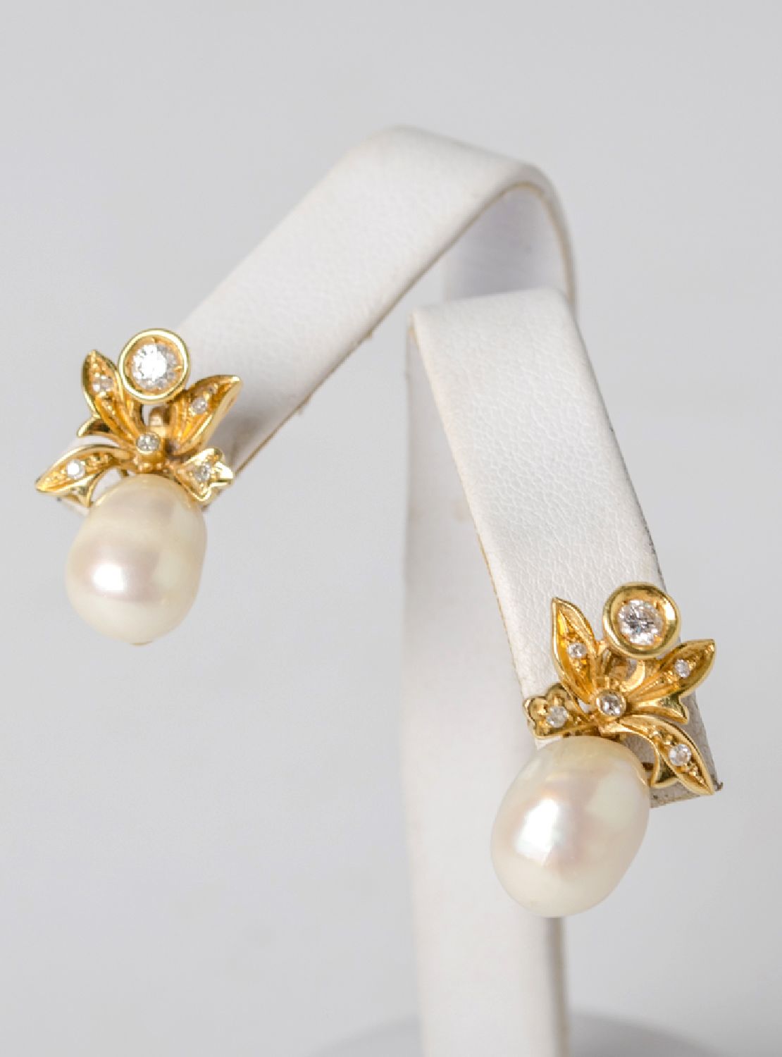 ORECCHINI in oro giallo 18 Kt. con brillanti centrali (Kt. 0.30) e brillanti di contorno (Kt. 0.10) e perle.