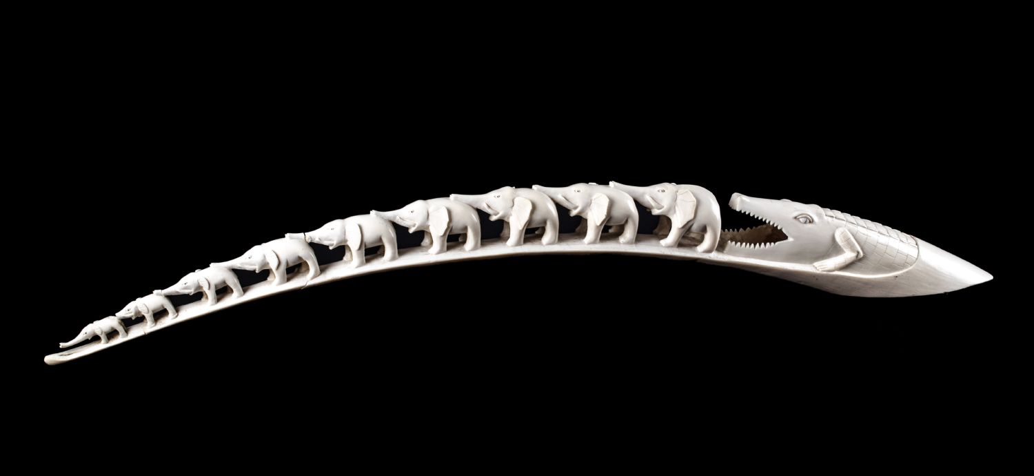 ZANNA in avorio "coccodrillo con fila d'elefanti" (restauri). Africa primi '900 Misure: cm 97,5