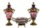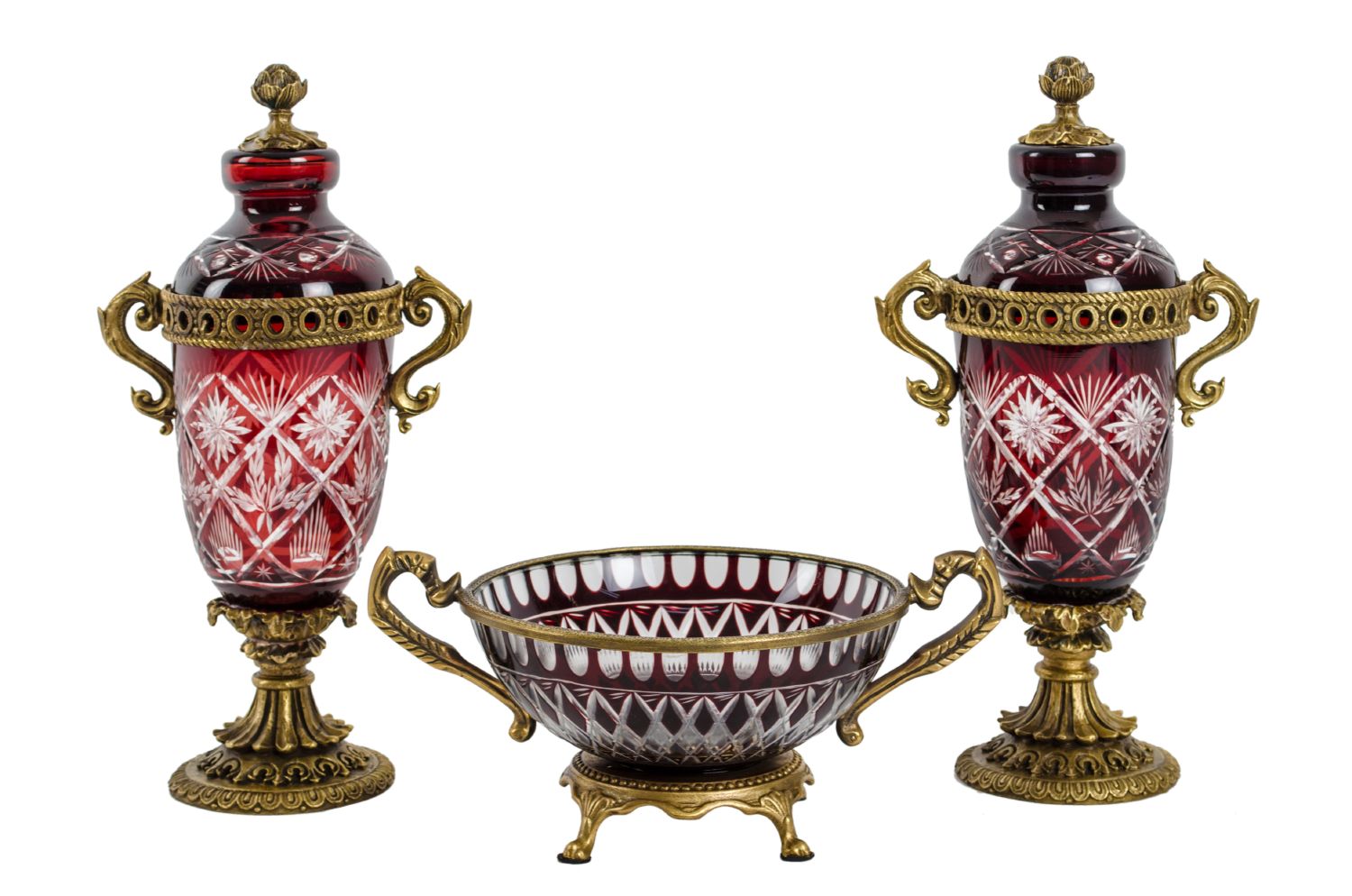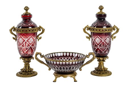 TRITTICO composto da due POTICHE e da PORTA BON BON in cristallo nei toni del rosso con bordo ed applicazioni in bronzo. Meta' '900 Misure: varie