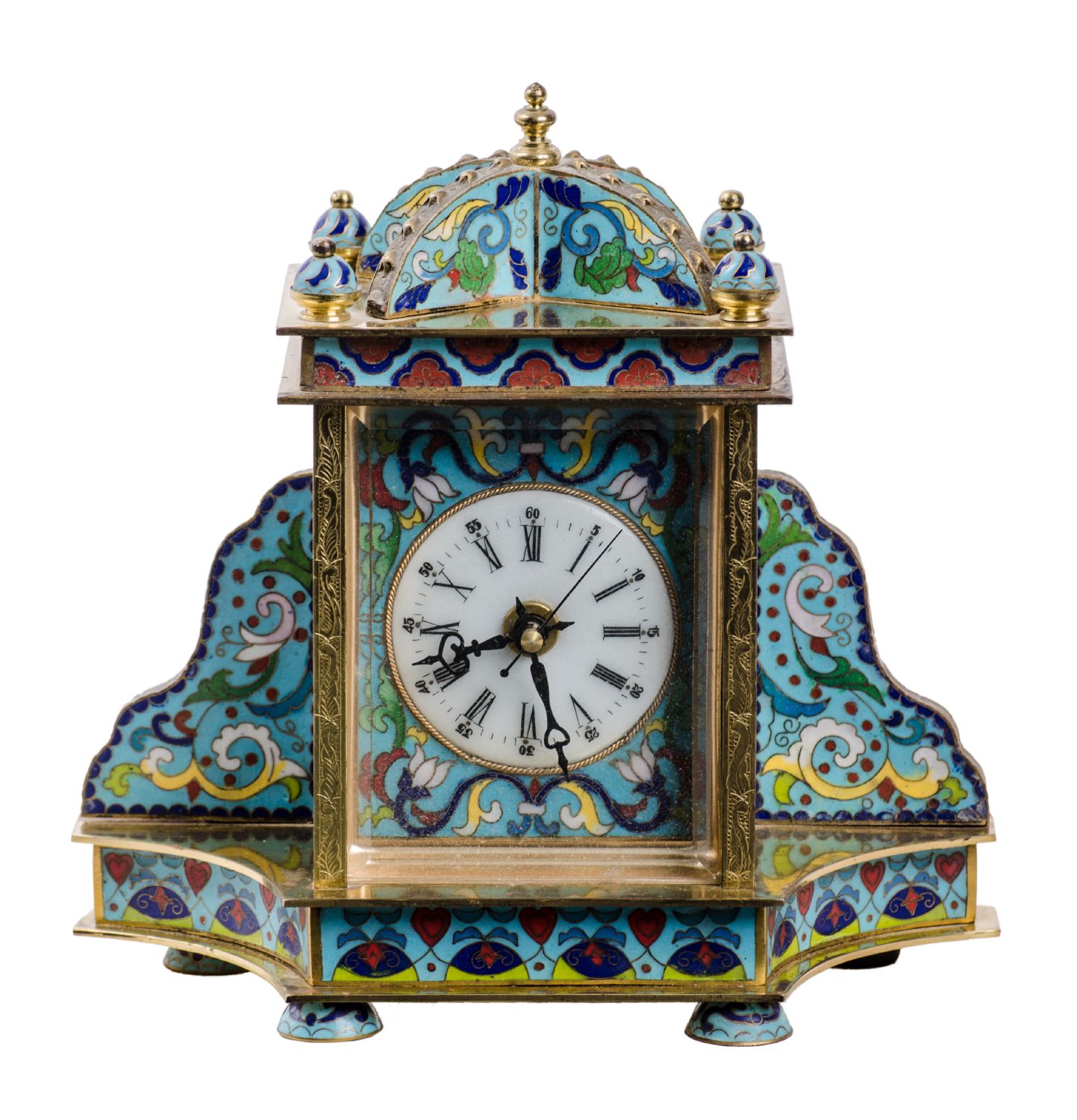 OROLOGIO in cloisonnet ed ottone. Cina meta’ ’900 Misure: cm 21 x 8,5 x h 22,5