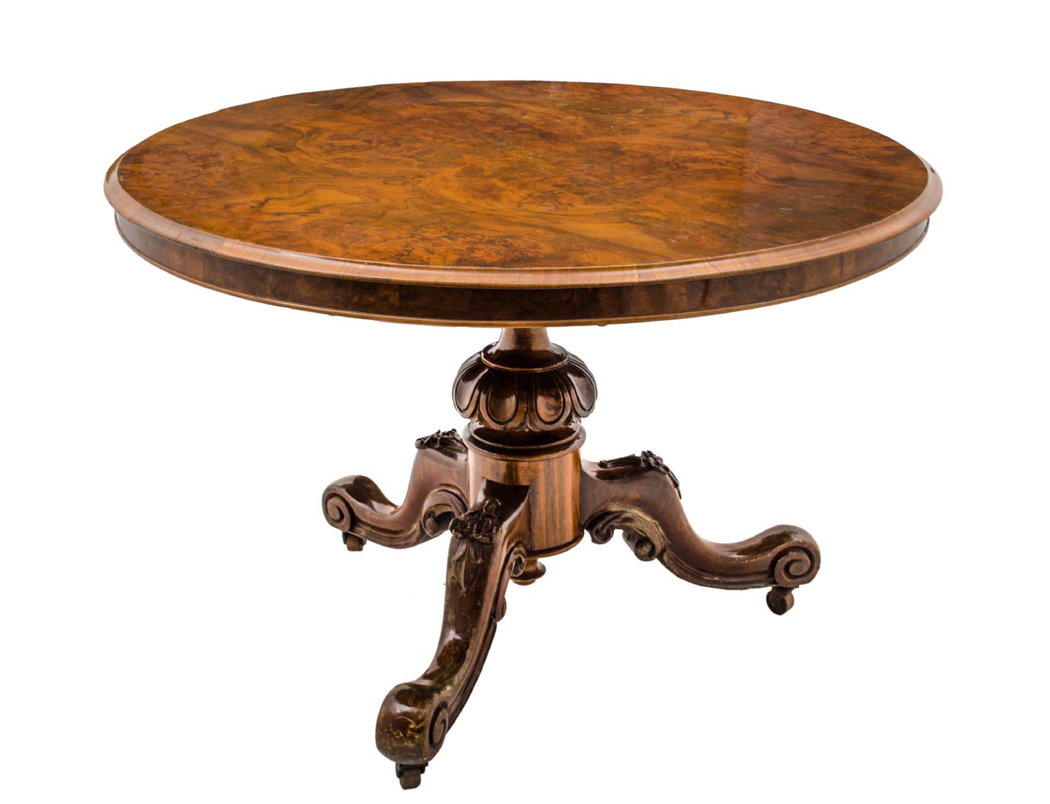TAVOLO tondo a vela in noce e radica di noce, piede tripode. II meta' XIX secolo Misure: diametro cm 120 x h 77