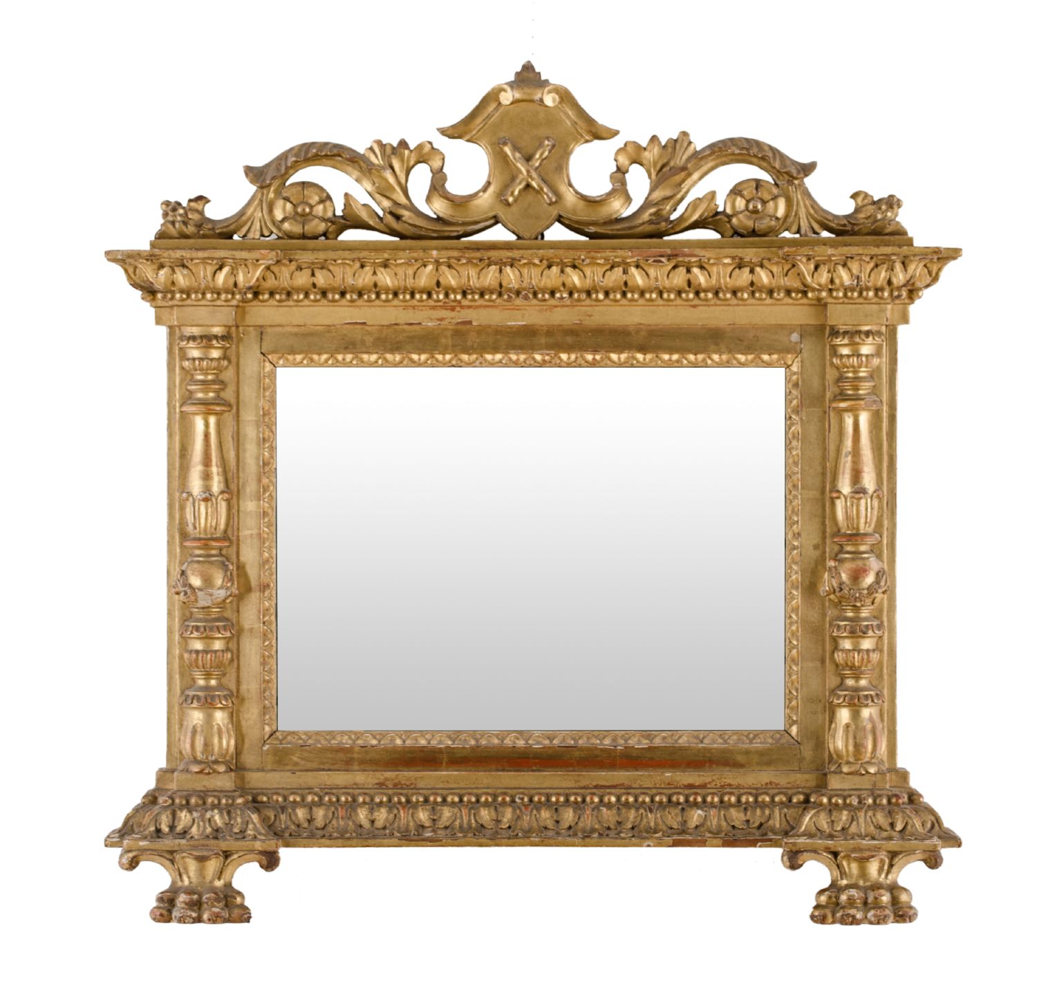 SPECCHIERA a tempietto in legno intagliato e dorato ad oro zecchino. Toscana...
