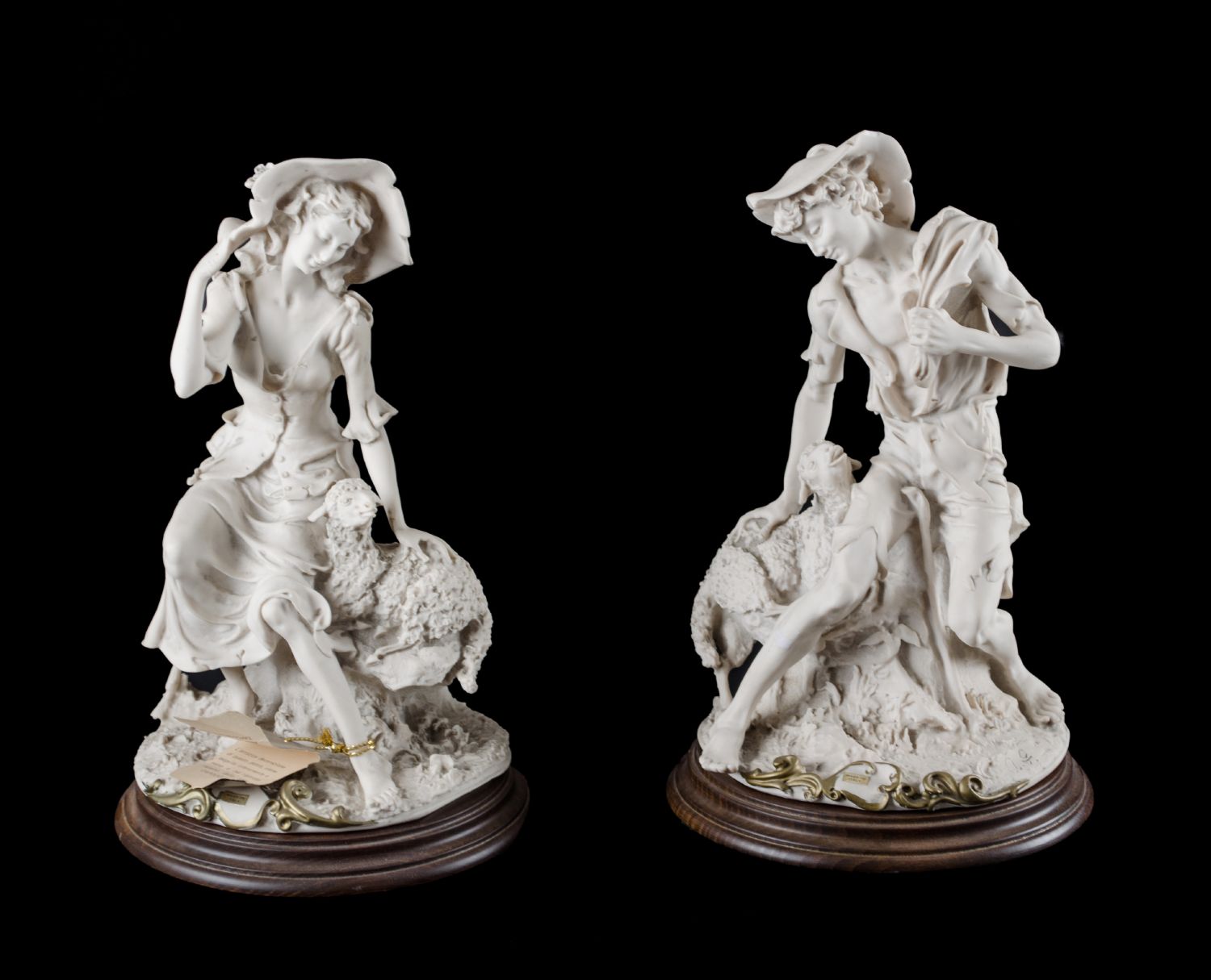 DUE SCULTURE in biscuit raffiguranti "pastori" e "pastorella". Italia XX secolo Misure: h cm 32