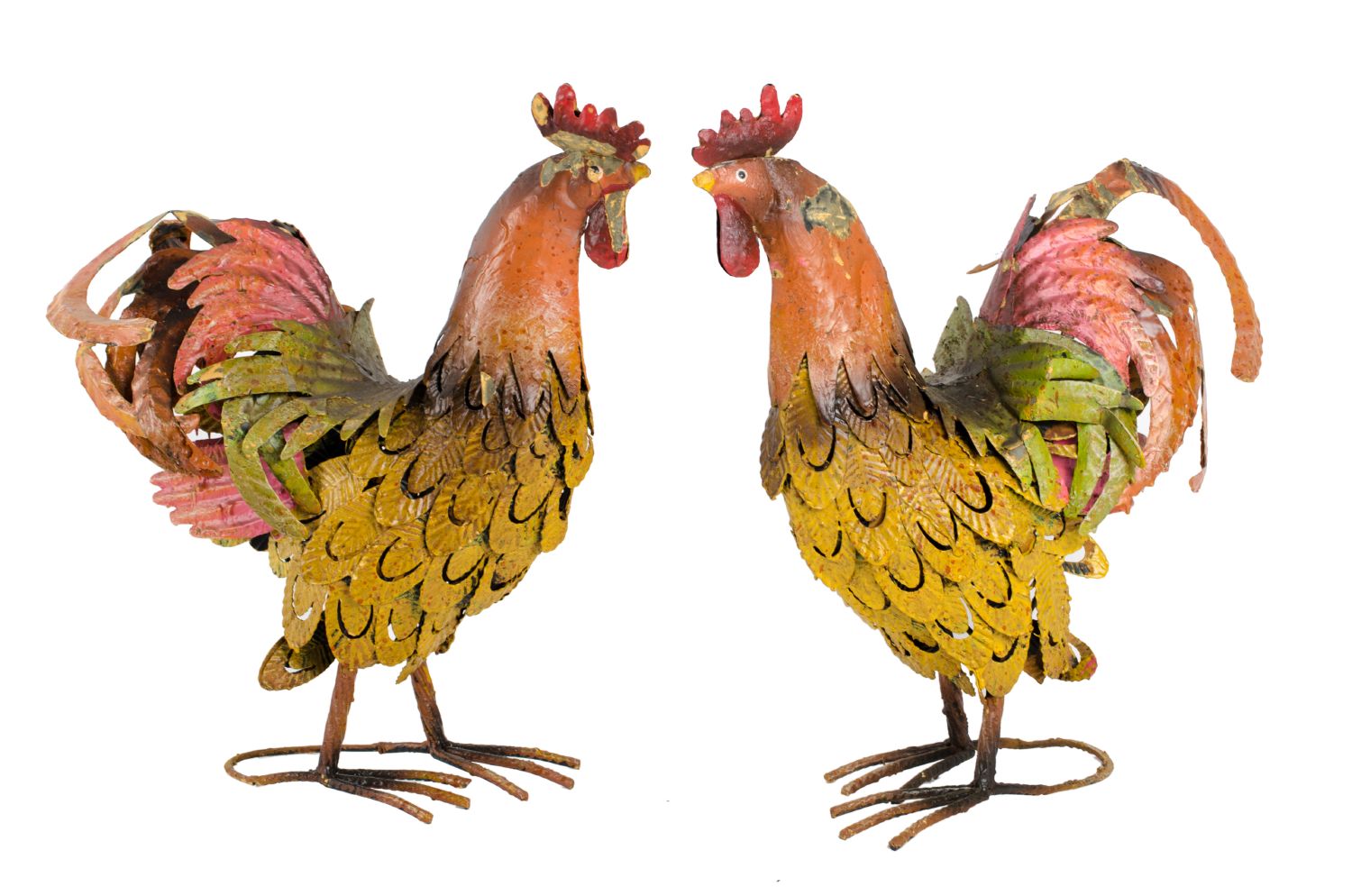 COPPIA SCULTURE in ferro dipinto raffiguranti "galli". XX secolo Misure: h cm 44