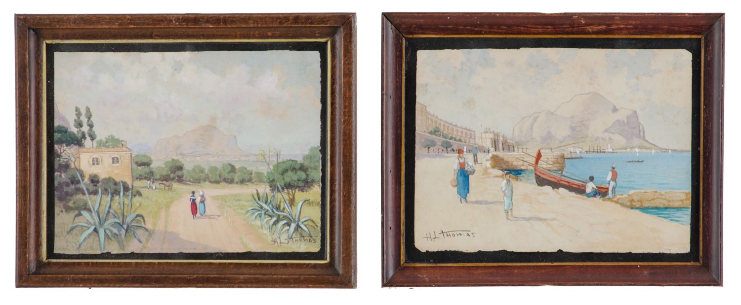 H. L. THOMAS DUE ACQUARELLI "foro italico a Palermo con personaggi" e "campagna palermitana con personaggi". XX secolo Misure: cm 23 x 16