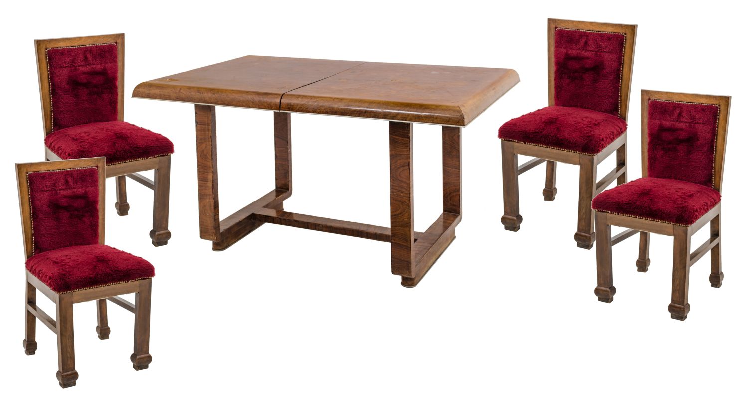 TAVOLO deco' con due prolunghi e quattro SEDIE in noce e radica di noce. Anni '30 Misure: varie