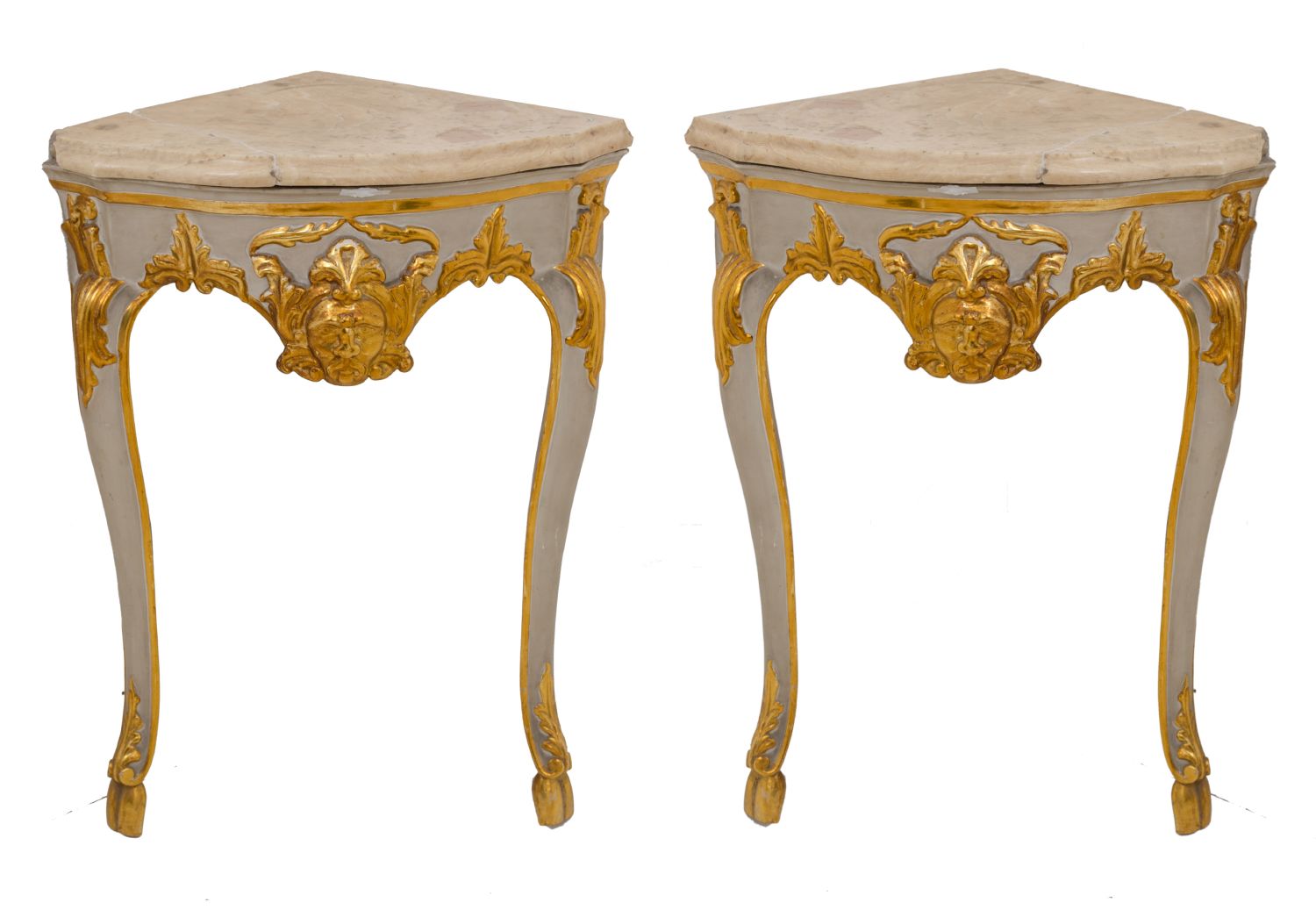 COPPIA ANGOLIERE in legno laccato e dorato, piano in marmo giallo venato. Sicilia XIX secolo Misure: cm 45 x 45 x h 83