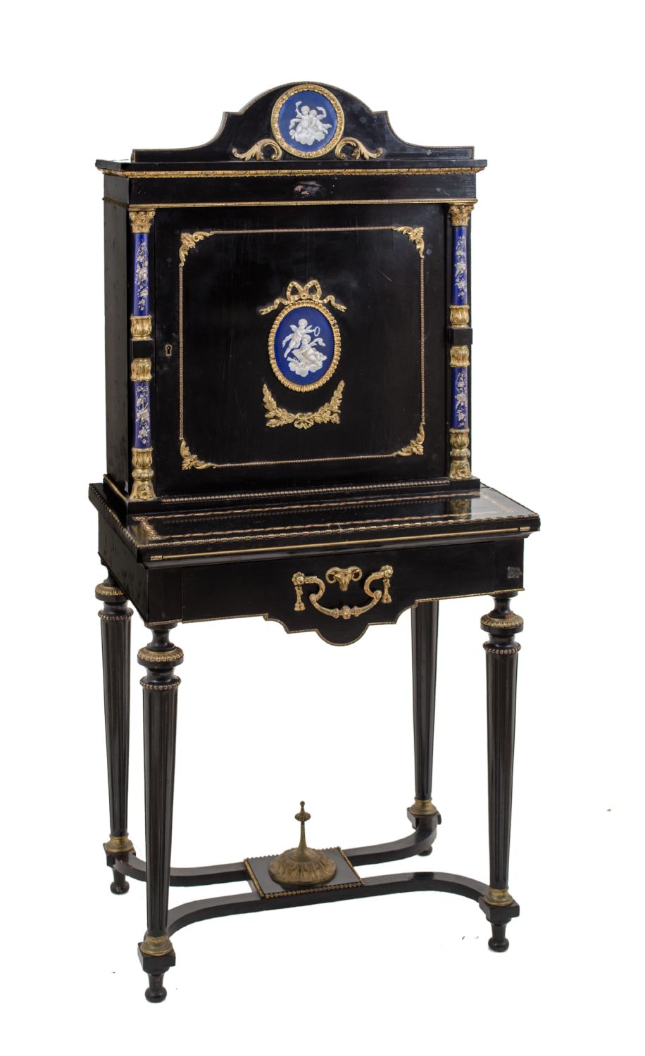 BONHEUR DE JOUR in ebano con placche in porcellana e guarniture in bronzo....