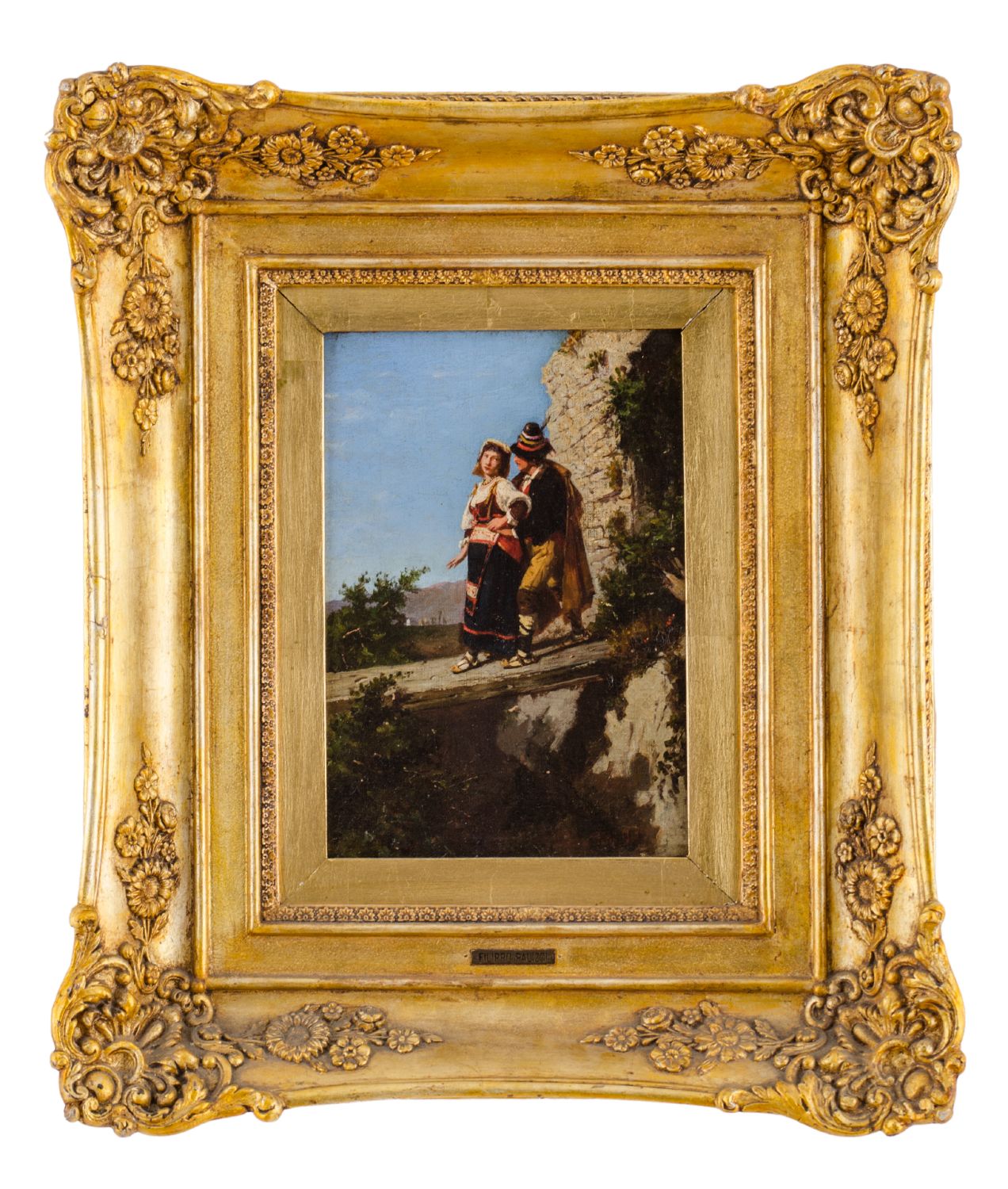 FILIPPO PALIZZI (Vasto 1818 - Napoli 1899) OLIO su tela "fanciulli sul ponticello" con dichiarazione d'autenticita' di Umberto Bencipa, sul retro l'opera riporta la targhetta di esposizione presso la Galleria d'Arte Moderna di Roma. Misure: cm 21 x 29