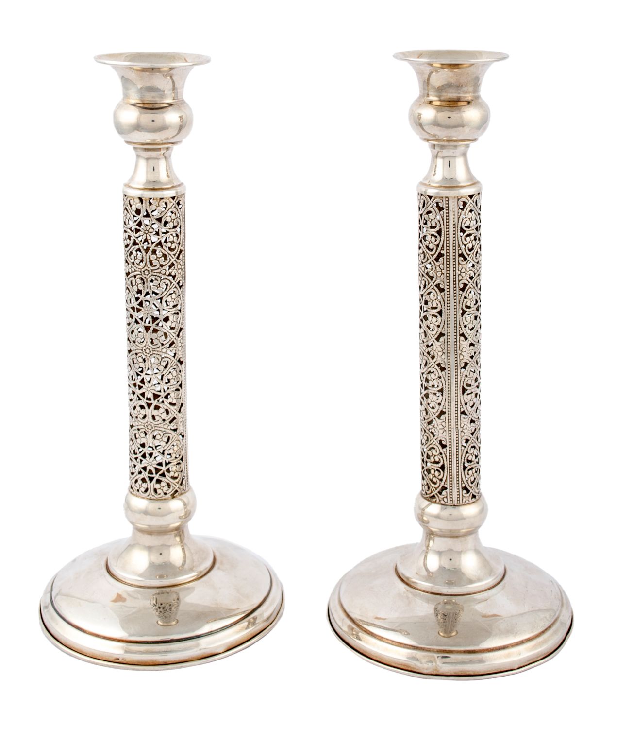 COPPIA CANDELIERI in argento con colonne traforate. Sicilia primi '900 Misure: h cm 24