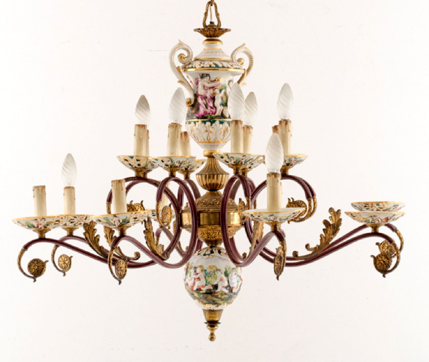 LAMPADARIO a sedici luci in ceramica e metallo. Italia anni '60 Misure: h cm 70
