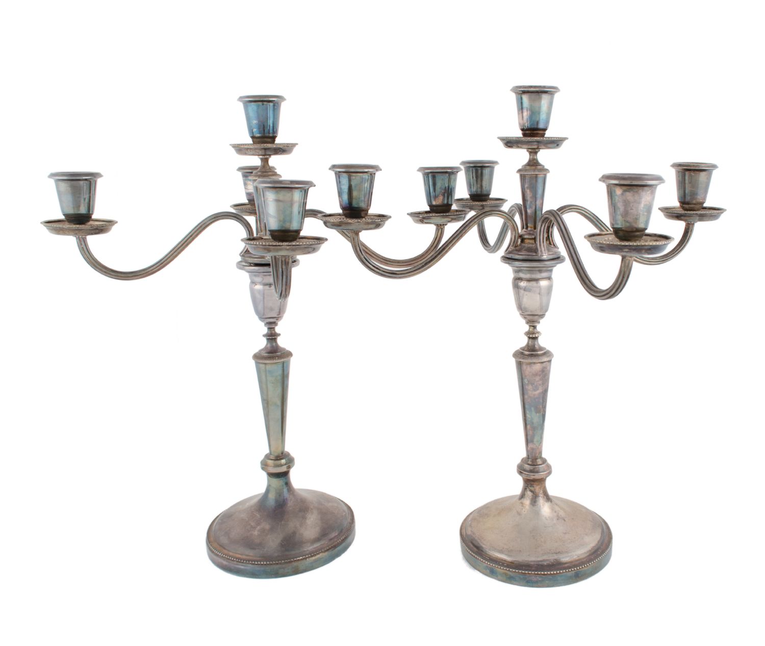 COPPIA CANDELABRI a cinque fiamme in argento (g. 1970). Italia XX secolo Misure: h cm 41