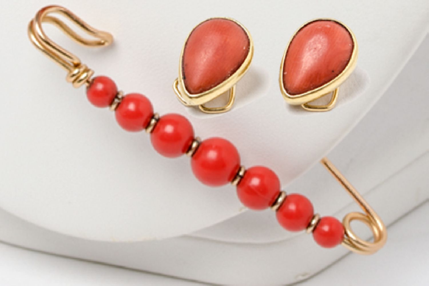 LOTTO composto da SPILLA in oro giallo 18 Kt. con corallo e da ORECCHINI In oro giallo 18 Kt. e gocce di corallo.