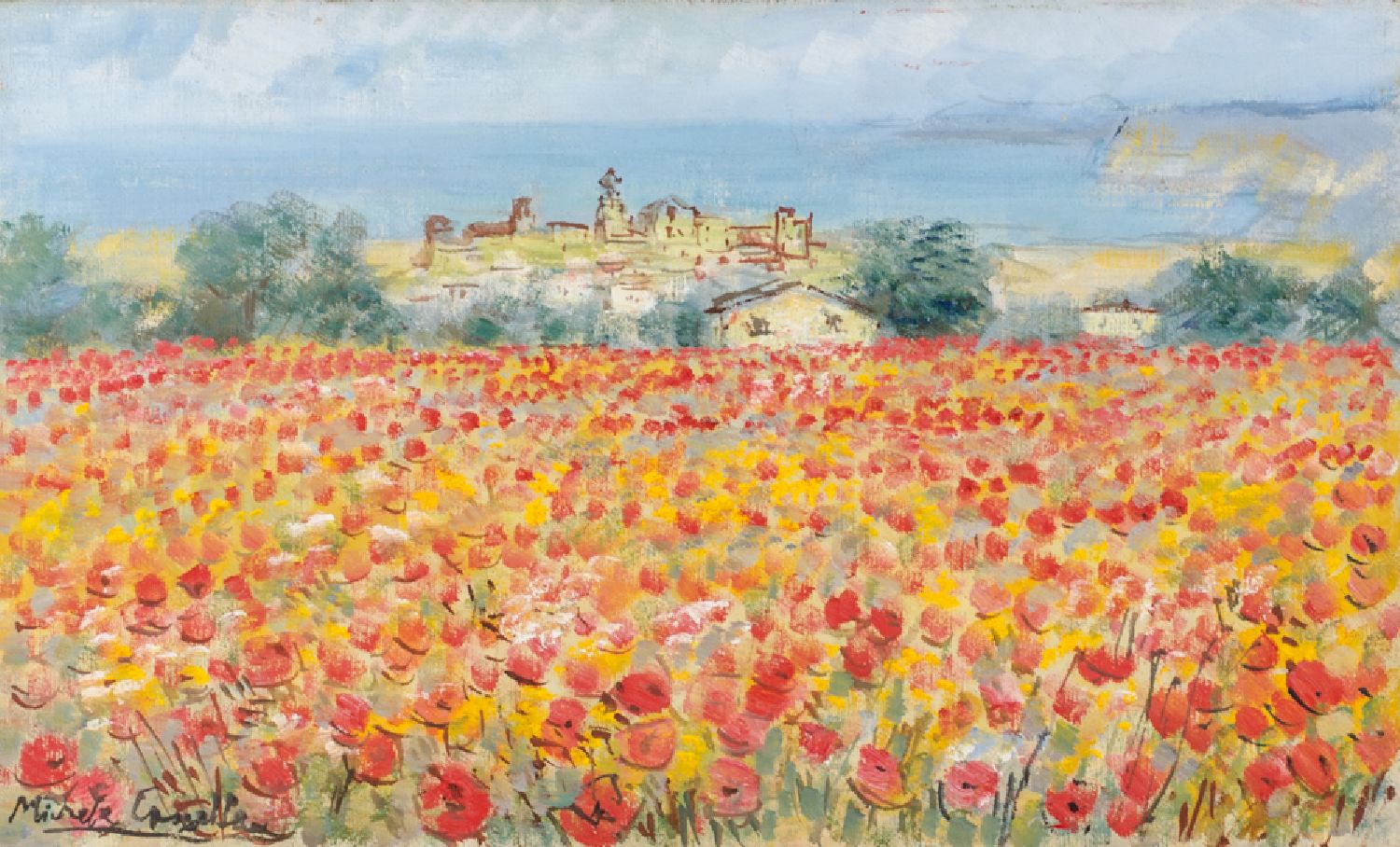 MICHELE CASCELLA (Ortona 1892 - Milano 1989) OLIO su tela "campo di papaveri" con autentica sul retro rilasciata da Rizzoli Finarte n. Cat 2045/P n.Cod. 0106/U/1978/BZ firmato in basso a sinistra. Misure: cm 50 x 30