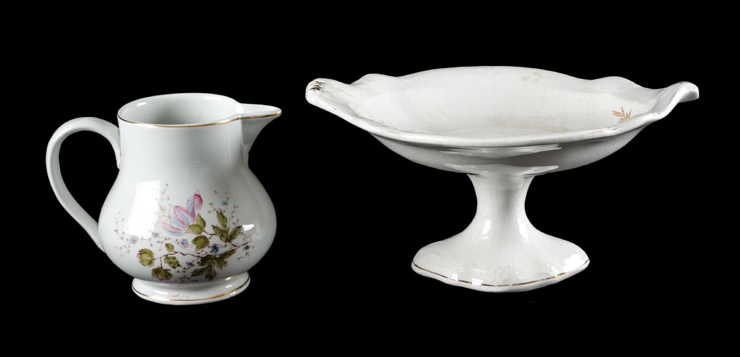 LOTTO composto da ALZATA e da BROCCA in ceramica Florio dipinta a mano a motivo floreale. Meta' '900 Misure: varie