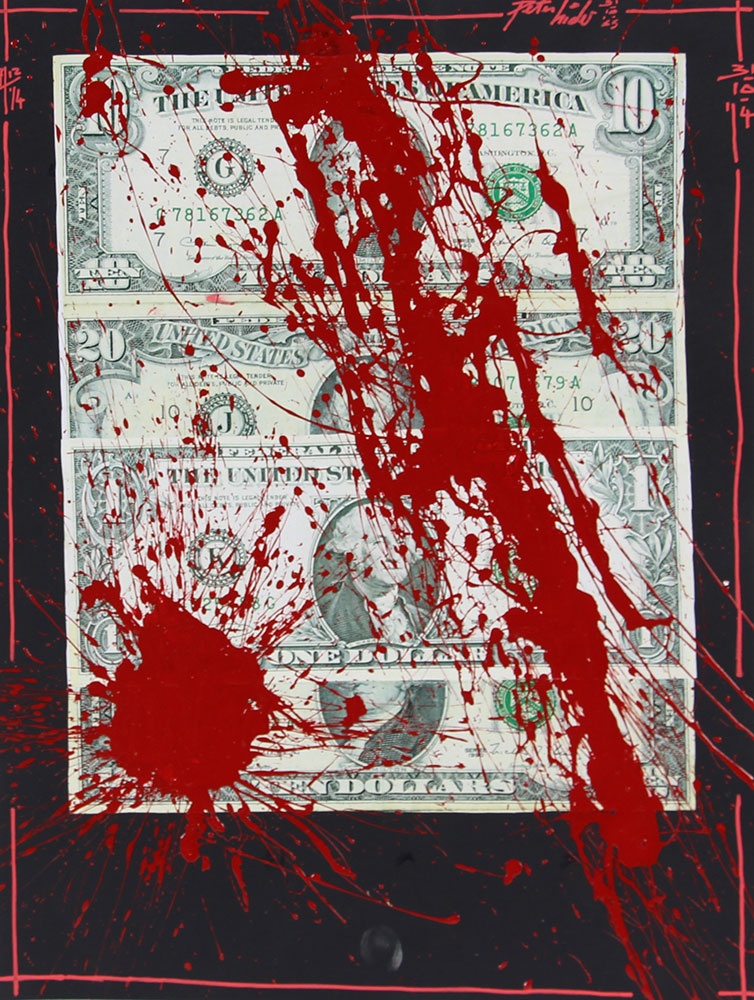 Hide Peter Blood Money!, 2014 tecnica mista e collage su carta, cm. 70x50 firmata in alto a destra, datata in alto a destra e sinistra, firmata, intitolata e datata al retro, certificato di autenticità dell'artista su fotografia senza cornice