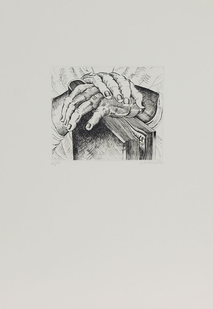 De Micheli Gioxe Le mani di Thomas Müntzer, 1973 incisione su carta, cm. 49,5x34,5 (lastra cm. 15x17,5), es. 46/70 firmata e datata in basso a destra, timbro a secco L'Elefante Rosso di Piacenza in basso a destra senza cornice