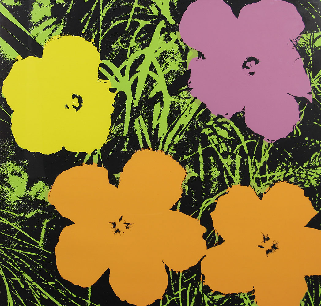 Warhol Andy Flowers serigrafia su carta, cm. 91,4x91,4 al retro timbri ad inchiostro blu "fill in your own signature" e "published by Sunday B. Morning"