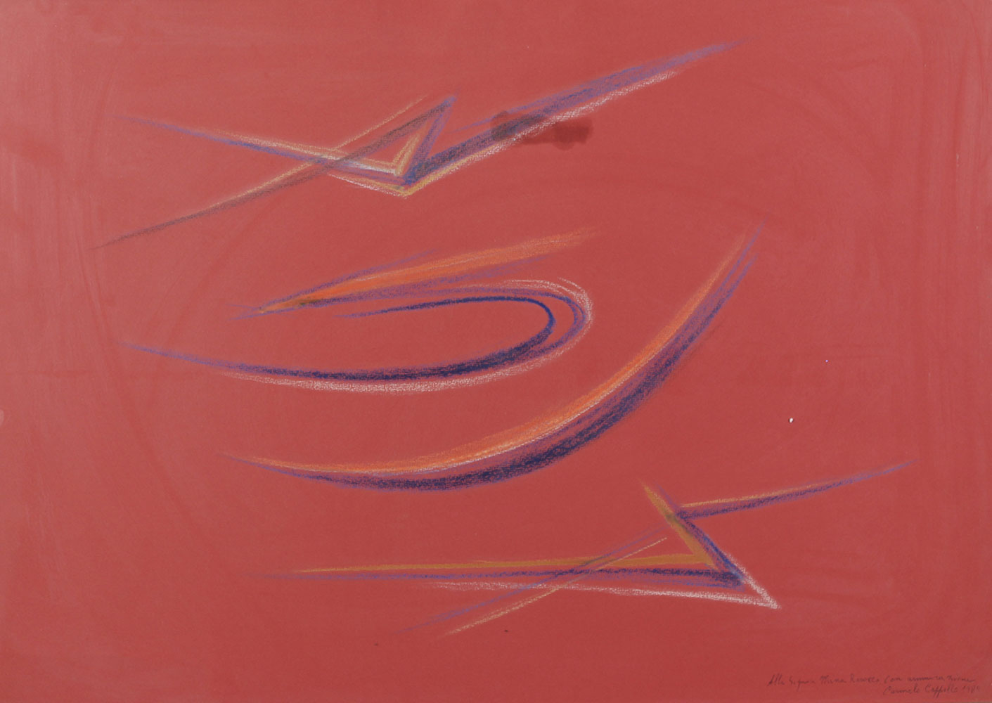 Cappello Carmelo Senza titolo, 1985 pastelli su cartoncino colorato, cm. 48x66 firmato, dedicato e datato in basso a destra, l'opera presenta una macchia in alto al centro, certificazione su fotografia della Galleria Arte Spiga di Milano