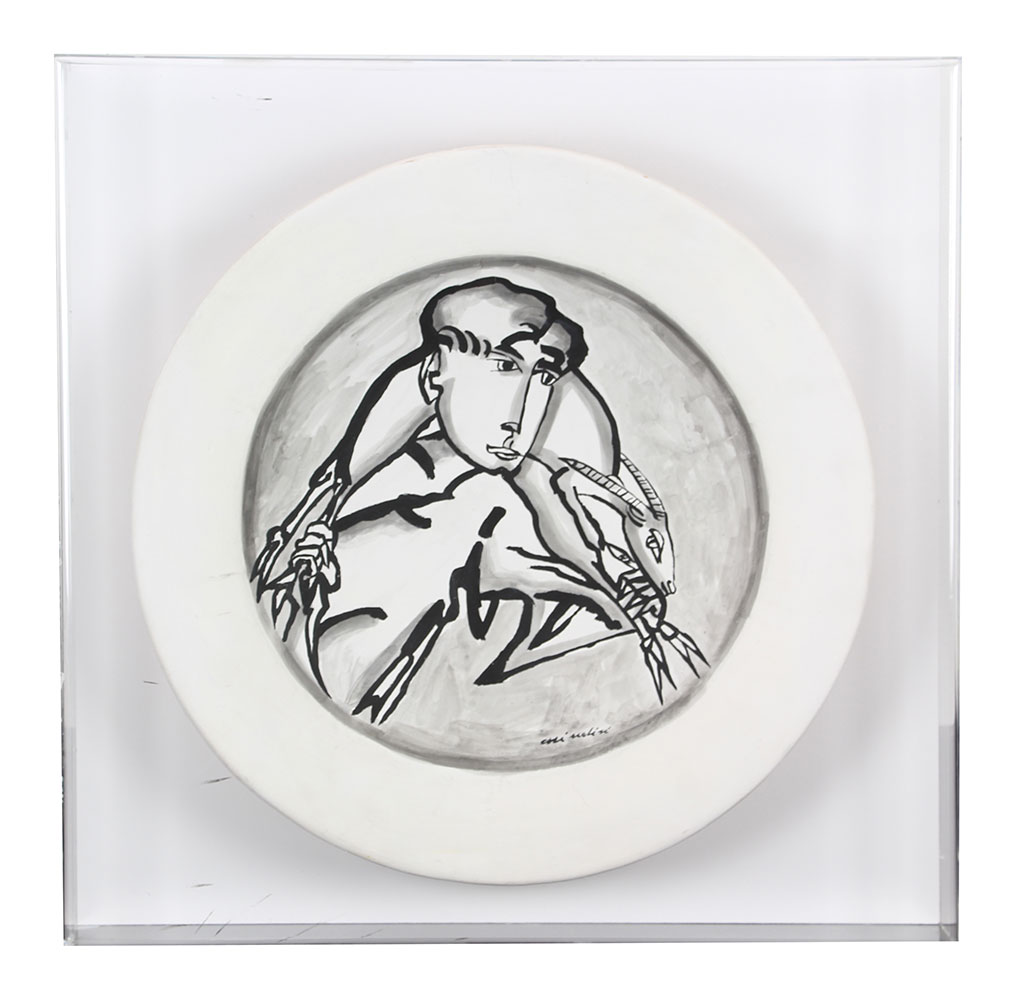 Brindisi Remo Pastorale piatto in terracotta dipinto entro teca di plexiglass, diam. cm. 50 (teca cm. 60x60x10), es. pezzo unico firmato in basso a destra, prototipo per multipli in vetro di Murano