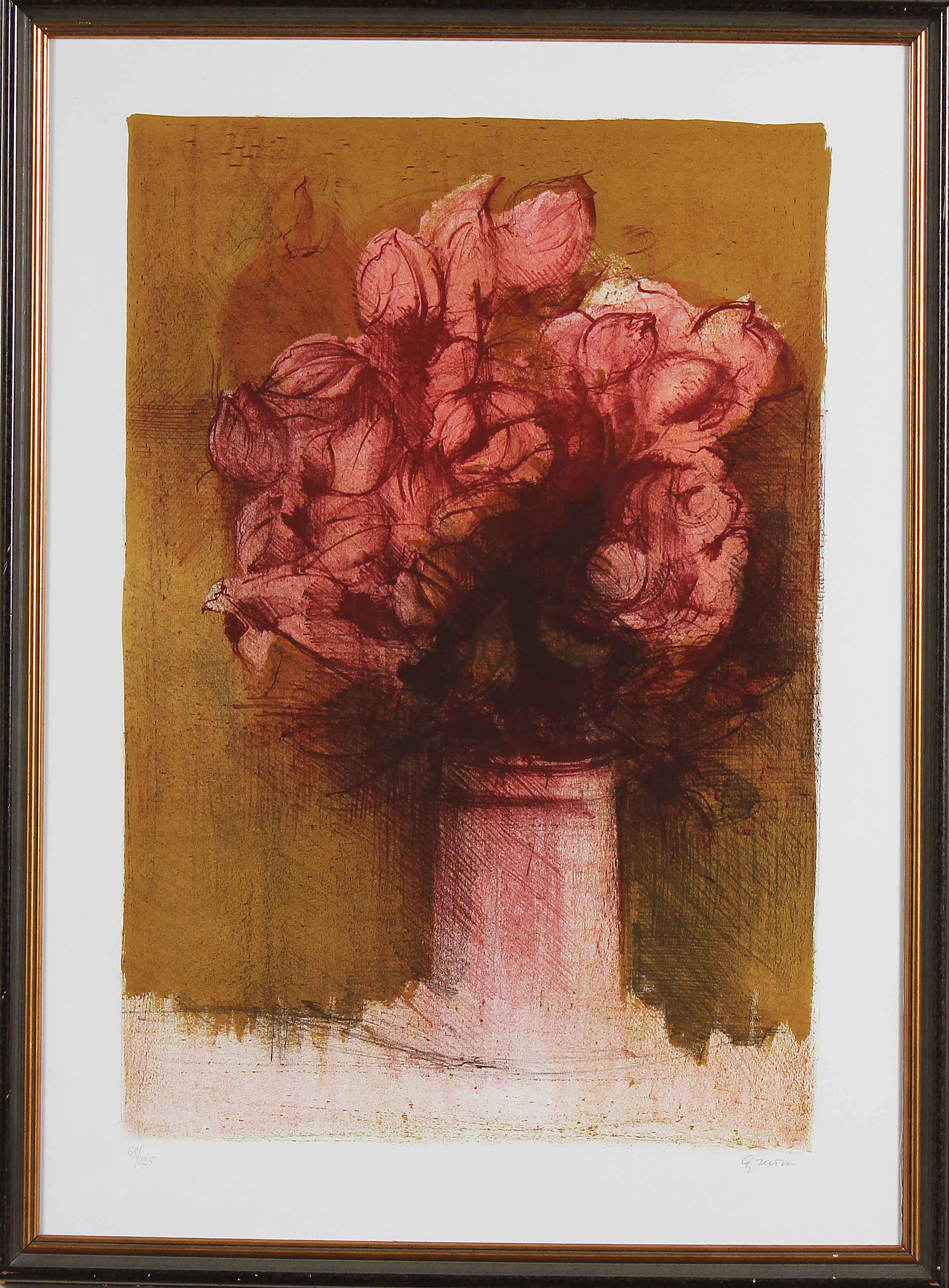 AJMONE GIUSEPPE (1923 - 2005) Vaso di fiori. Litografia. Cm 50,00 x 70,00. 68/125. Tiratura e firma a matita. Al retro descrizione dell' opera. Cornice presente