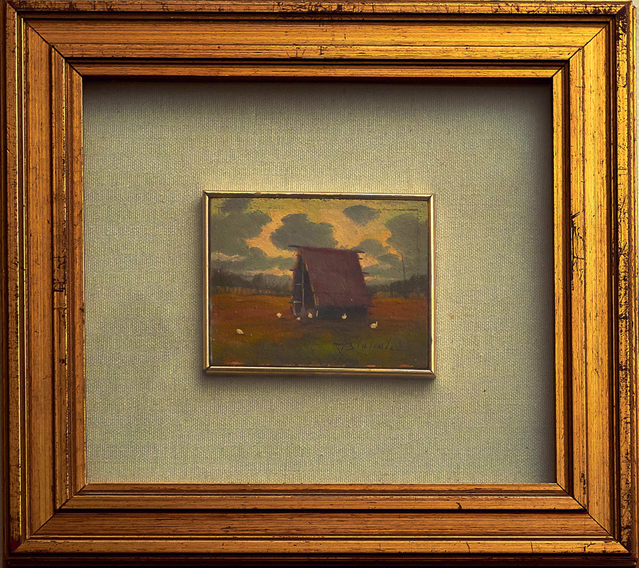 Lotto 14 | FRANCO BIONDI Capanna al tramonto Olio su tavola cm. 8x10 Firma in basso a...
