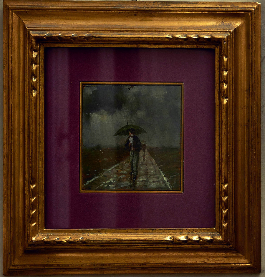 IGNOTO Sotto la pioggia Olio su tavola cm. 10,5x10,5 Firma illeggibile in...