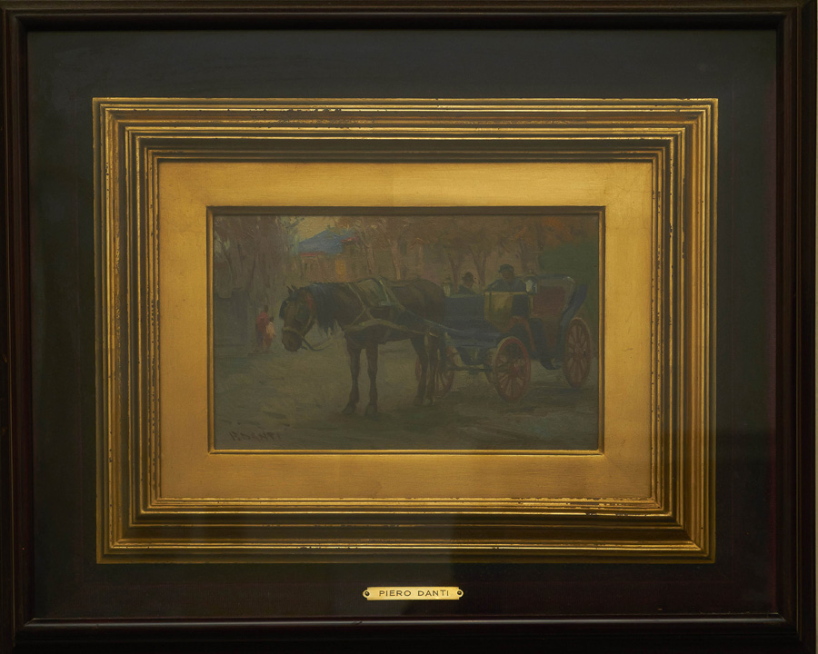 PIERO DANTI Carrozzella in periferia Olio su cartone cm. 14x22 Firma in basso a sinistra e sul retro Cornice Salvestrini