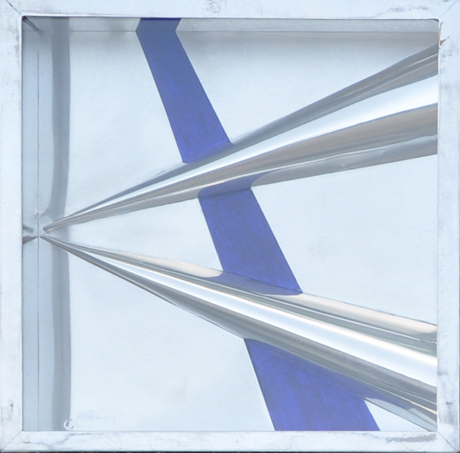 CESARINA SEPPI Composizione Alluminio e tecnica mista in teca di metallo cm. 20,5x21x6 Firma in basso a sinistra e sul retro Certificato su foto rilasciato dalla Galleria d’arte Giorgio Ghelfi, Verona