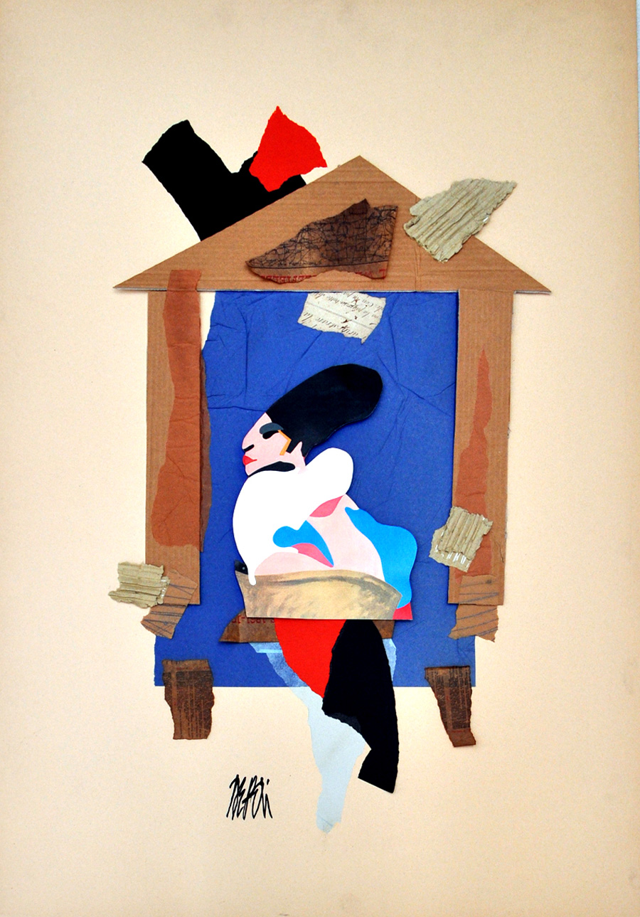 FABIO DE POLI Teatrino, fine anni ‘90 Tecnica mista e accumulazione di cartoni sagomati su cartone cm. 103x72 Firma in basso al centro