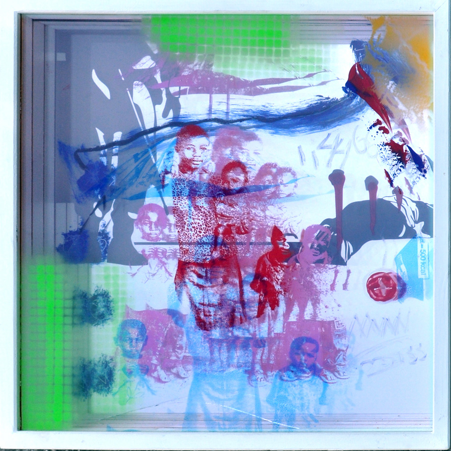 GUSTAVO MAESTRE Giornada di concienciacion, 2011 Tecnica su vetri assemblati in teca di legno cm. 50x50x10 Firma, data e titolo sul retro