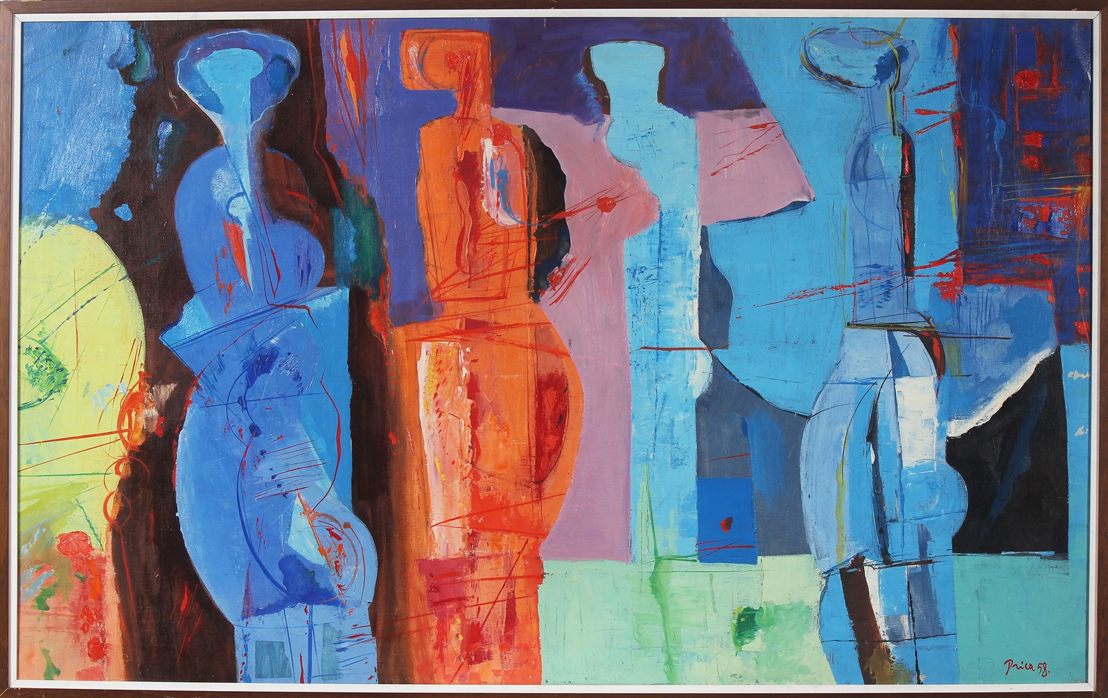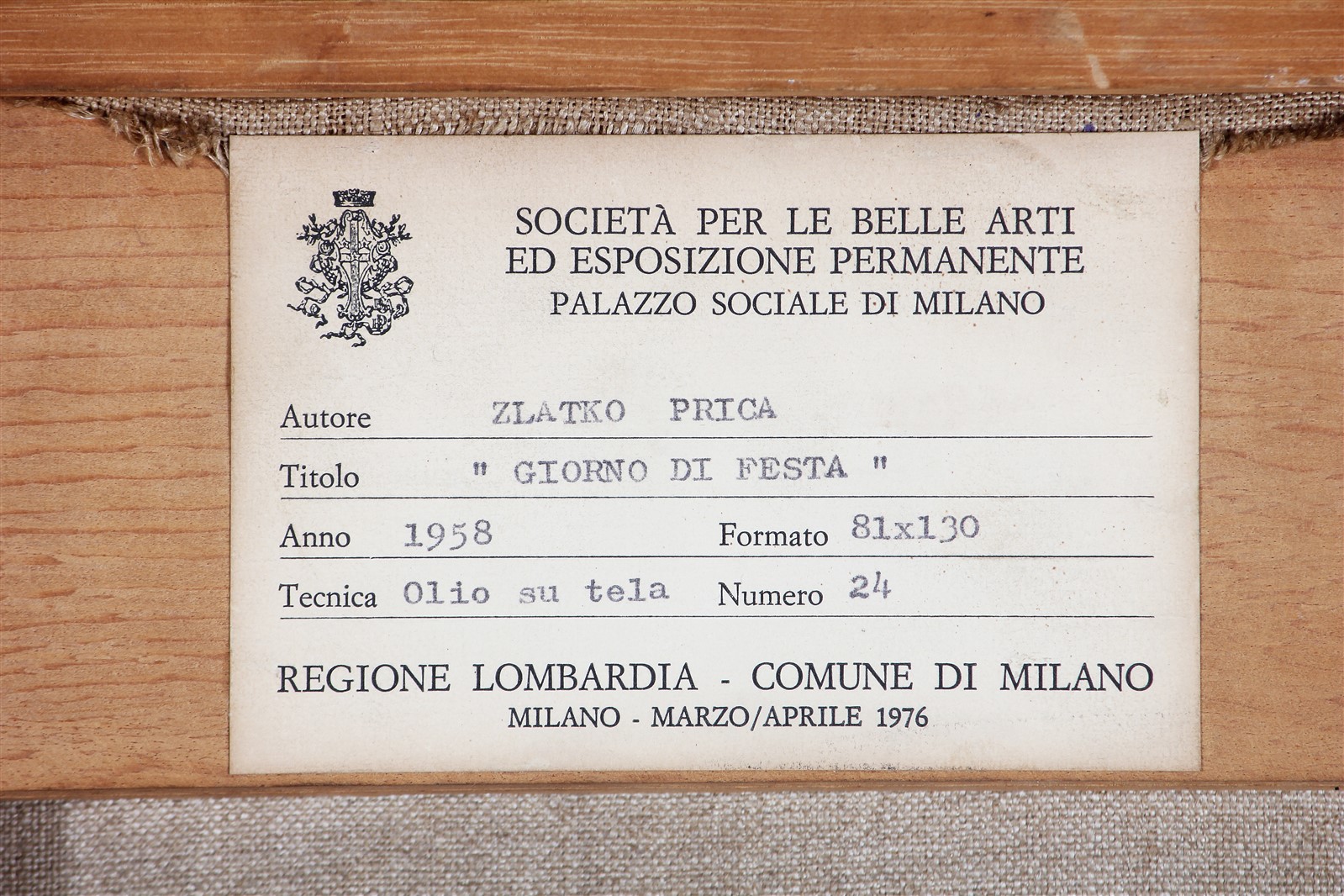 PRICA ZLATKO (1916 - 2003) Giorno di festa. 1958. Olio su tela . Cm 130,00 x 81,00. Firma e anno in basso a destra. Al retro cartiglio della Società per le Belle Arti ed Esposizione Permanente, Palazzo Sociale di Milano. Esposizioni: Zlatko Prica, trentacinque anni di pittura 1940-1975, Palazzo Della Permanente, Milano, Marzo - Aprile 1976. Pubblicazioni: Prica, a cura di Mario Valsecchi e Corrado Marsan, Luigi De Tullio Editore, pag.281, tav.141 (allegato all'opera). Cornice presente