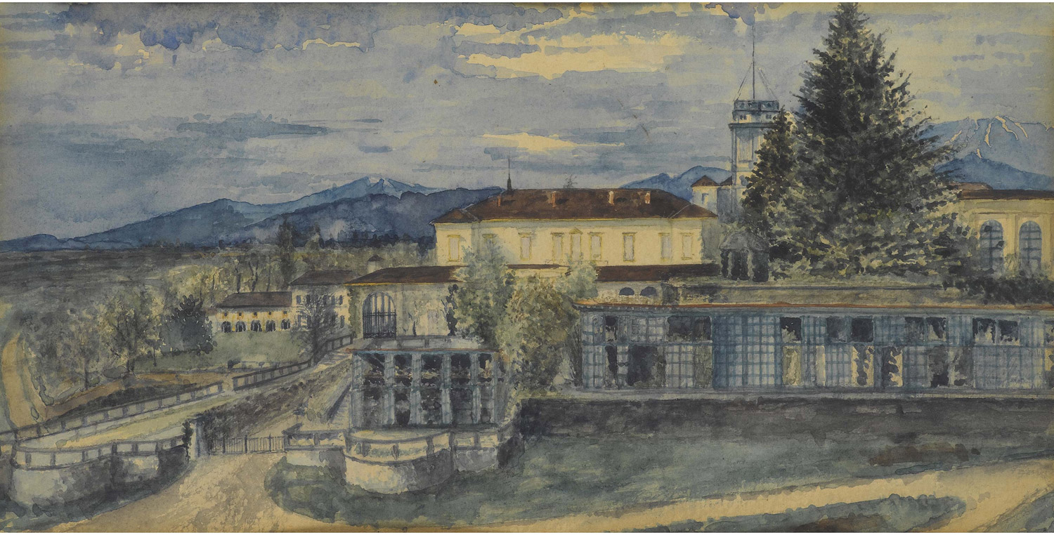 Ester Mauri (Lesmo 1866-Mariano Comense 1919) La villa del "Gernetto" a Lesmo Acquarello su carta Firmato Misura 16x31 cm