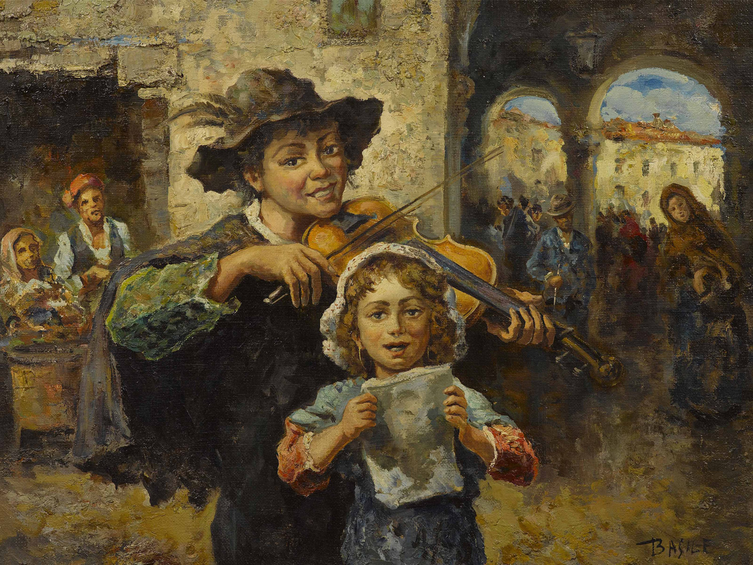 A. Basile (XX secolo) Giovane suonatore in strada Olio su tela Firmato Misure 60x80 cm