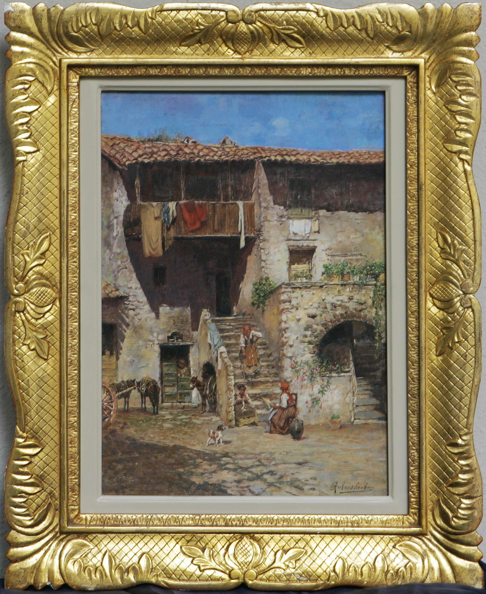 SANTORO RUBENS (1859 - 1942) Rustico con tre contadine in primo piano, olio su tela Cm 23,9x34,3 Firma in basso a destra.