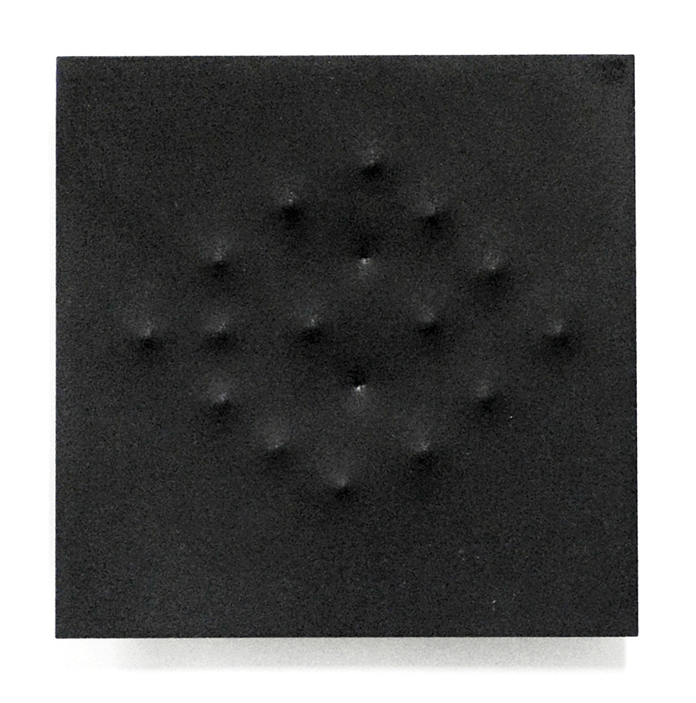n° 17 spari di pistola cal. 5,56 su lastra in alluminio (colore nero) cm. 20x20, firma al retro, dichiarazione d'autenticità dell'artista su foto.