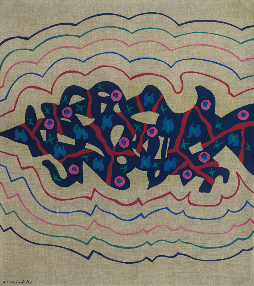 vinilico su tela grezza cm. 80x70, firma e anno in basso a destra, opera registrata presso l'Archivio Accardi Sanfilippo (Roma) come da foto allegata.