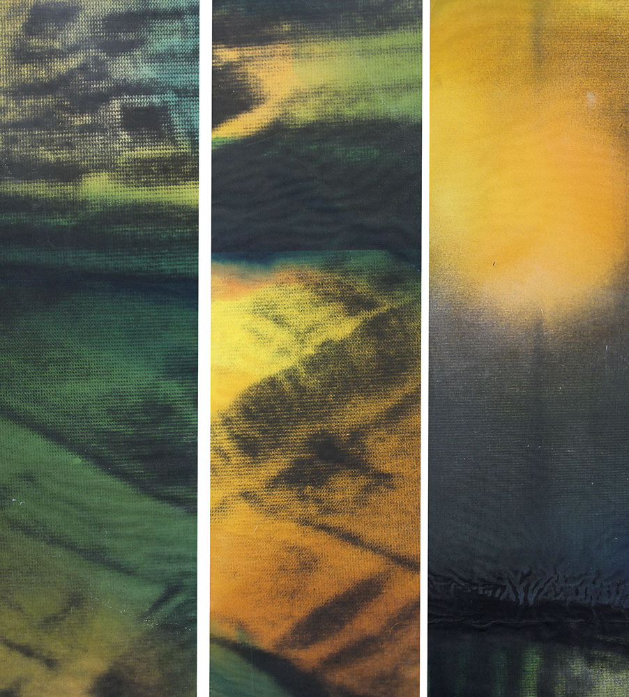 pittura e riporto fotografico su 3 tele cm. 135x40 cadauna, opera non firmata, dichiarazione d'autenticità dell'artista su foto.