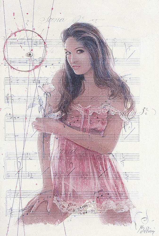 tecnica mista su spartito originale manoscritto del 1915 applicato su tavola cm. 32x21,5; firma in basso a destra, firma, titolo, tecnica e timbro dell'artista al retro, opera riprodotta sul sito dell'artista all'indirizzo "www.giannibellini.it/spartiti-musicali/ngallery/page/2".
