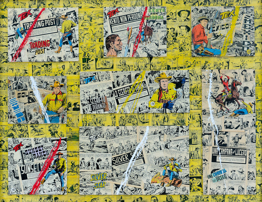 collage di fumetti originali e acrilico su faesite cm. 83x106, firma, titolo, anno, archivio ed etichetta dell'artista al retro.