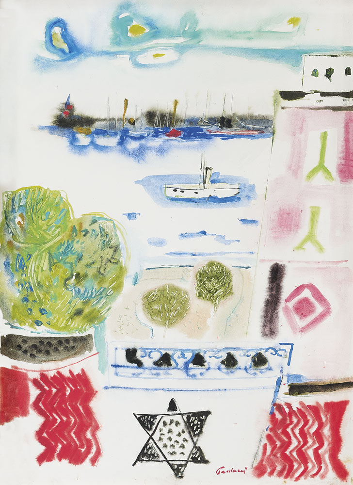 gouache su carta intelata cm. 66x48, firma in basso al centro, timbro per autenticità e provenienza della Galleria d'Arte Santacroce (FI) su foto.