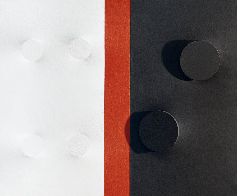 acrilici e applicazioni su tela estroflessa cm. 80x100x4, firma e anno sul bordo destro in basso, dichiarazione d'autenticità dell'artista su foto, opera priva di cornice.