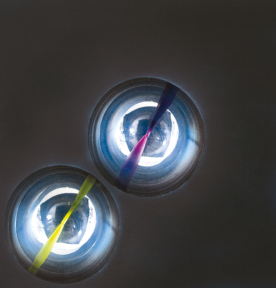 assemblaggio di materie plastiche 2 semisfere in romboidale cm. 49x49x8 (lato cm.35), titolo, firma e anno al retro, dichiarazione d'autenticità dell'artista su foto.