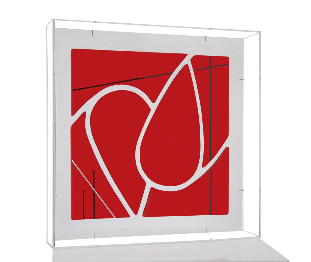 acrilico su 6 elementi in tela estroflessa cm. 32x32x5,5; entro teca in plexiglass cm. 41x41x9, firma al retro, dichiarazione d'autenticità dell'artista su foto.
