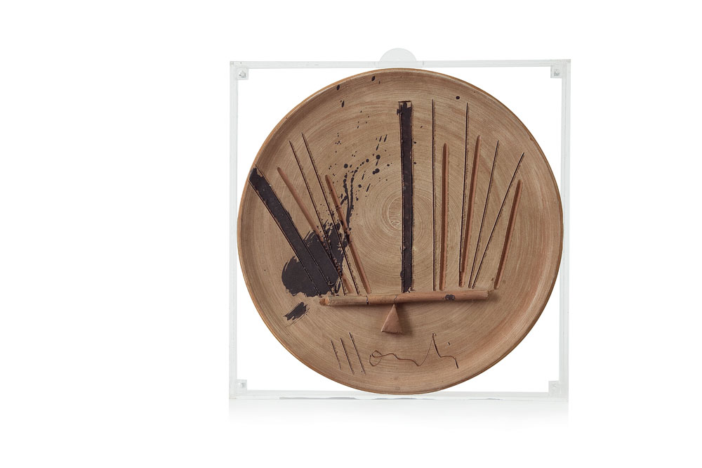 piatto in terracotta diametro cm. 40, firma in basso al centro, (pezzo unico), entro teca in plexiglass.