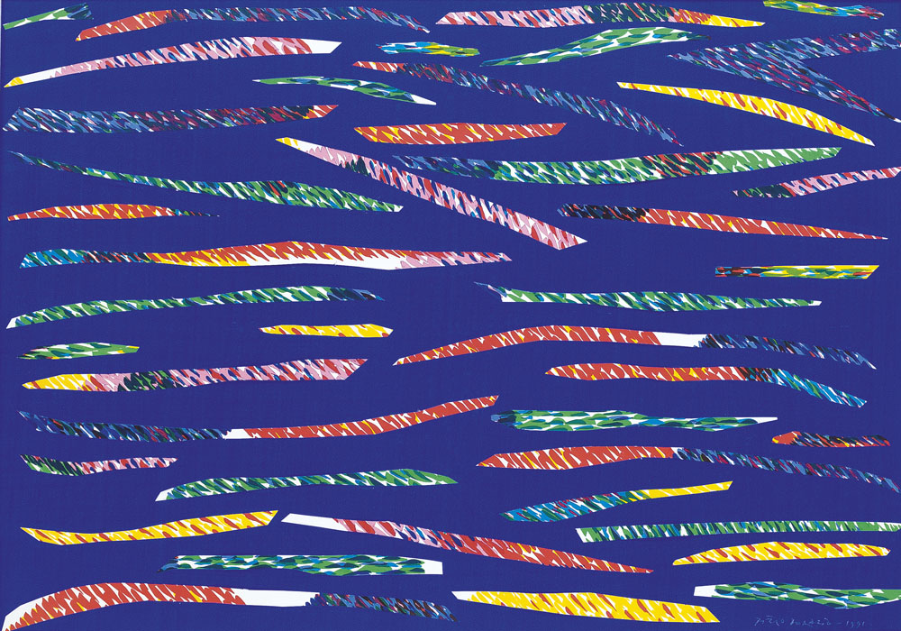 tempera su carta a mano con collage di frammenti serigrafati cm. 76x105, firma e anno in basso a destra, dichiarazione d'autenticità dell'artista su foto.