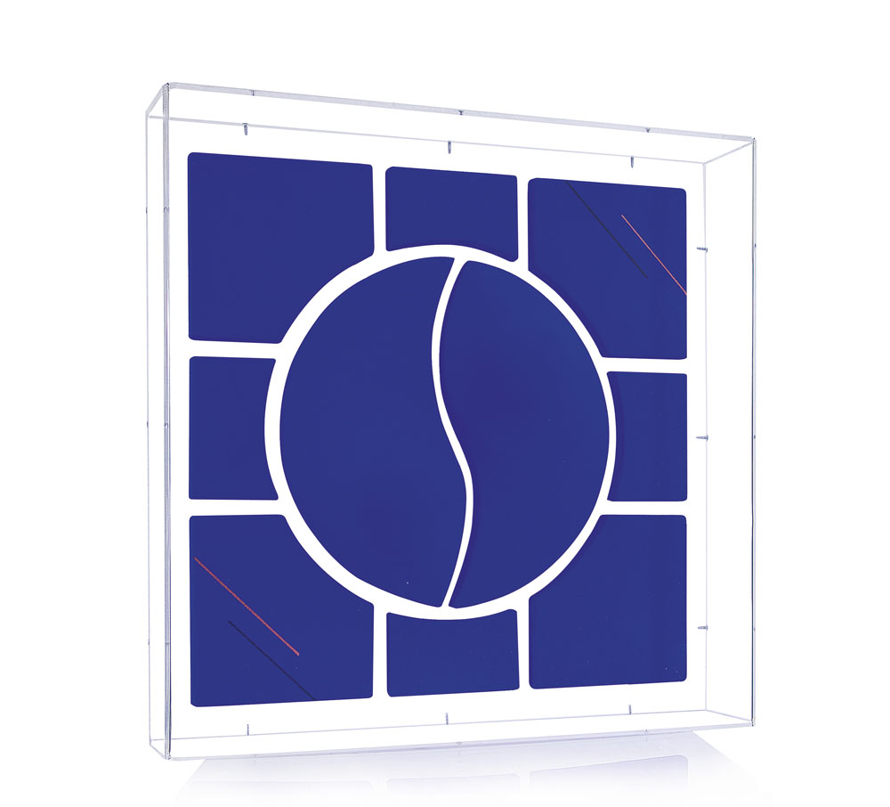 acrilico su 10 elementi in tela estroflessa cm. 44x44x7, entro teca in plexiglass cm. 51x51x10, firma al retro.