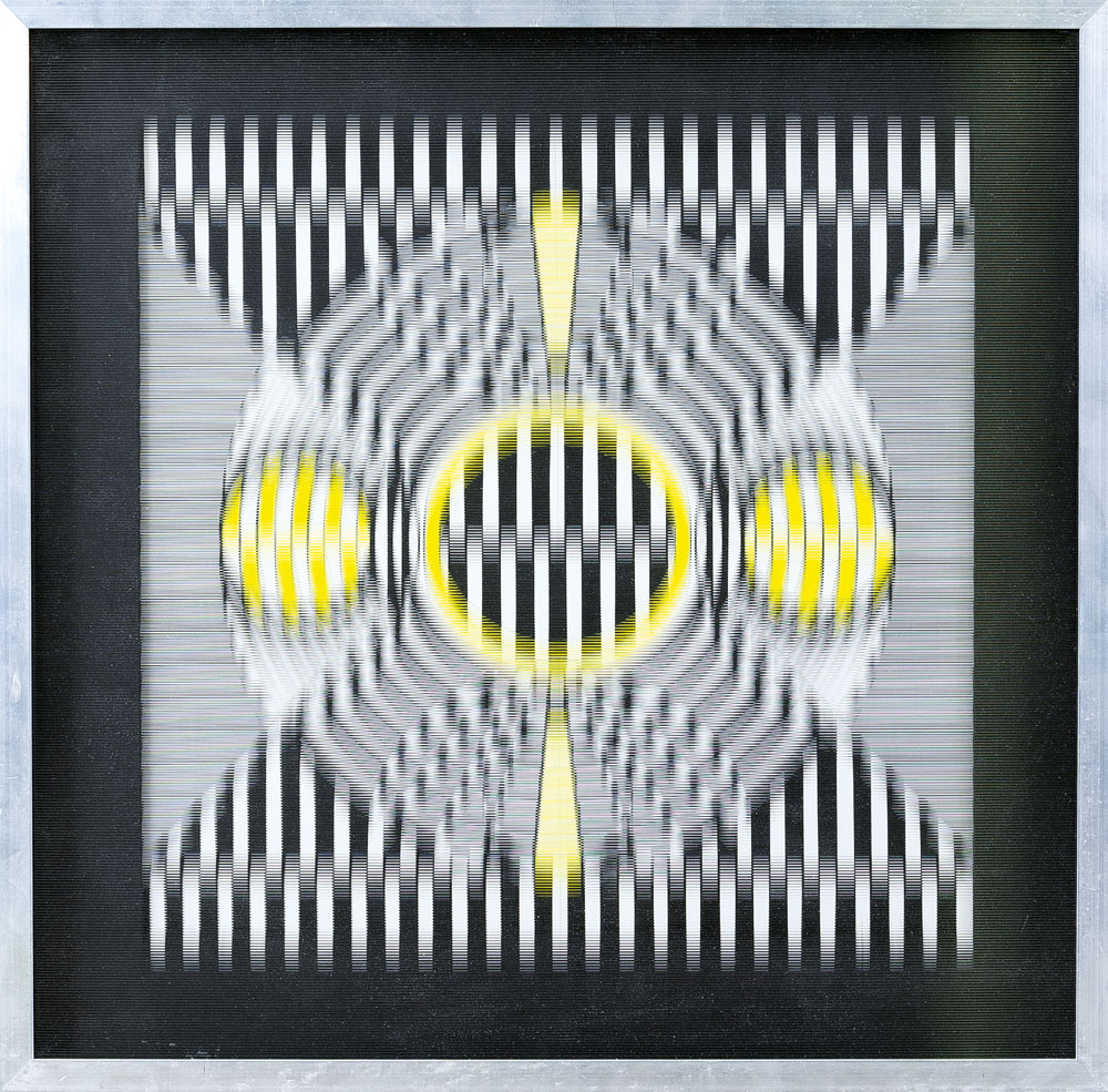 tecnica mista su cartoncino con copertura in plexiglass zigrinato a linee orizzontali cm. 50x50; firma, anno, etichetta e timbro dell'artista al retro, dichiarazione d'autenticità dell'artista e timbro della Anti: galleria d'arte contemporanea (Mestre-VE) su certificato allegato.