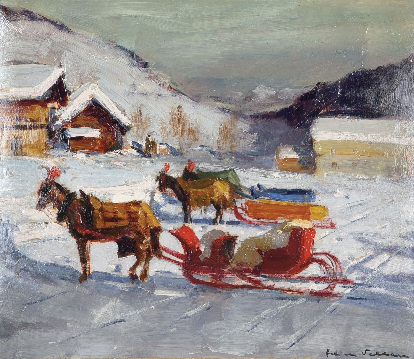 VELLAN FELICE (Torino 1889 – 1976) - "A St-Moritz Bad" primi anni '40, 31x36 olio su cartone. Opera firmata in basso a destra e al retro con titolo e dedica ad personam in data Natale 1945