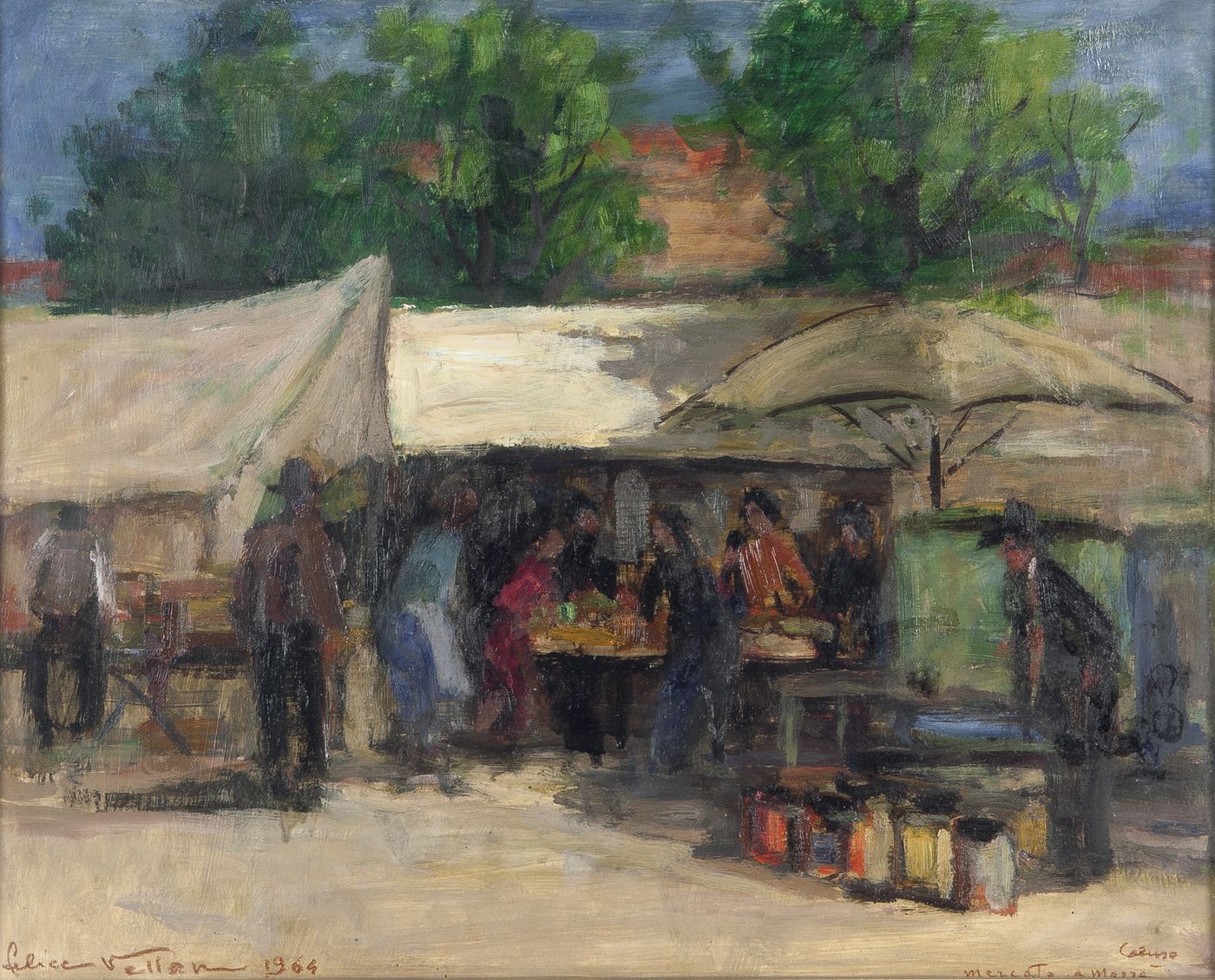 VELLAN FELICE (Torino 1889 – 1976) - "Mercato a Mazzè" 1964, 40x50 olio su cartoncino. Opera firmata e datata in basso a sinistra ed intitolata in basso a destra